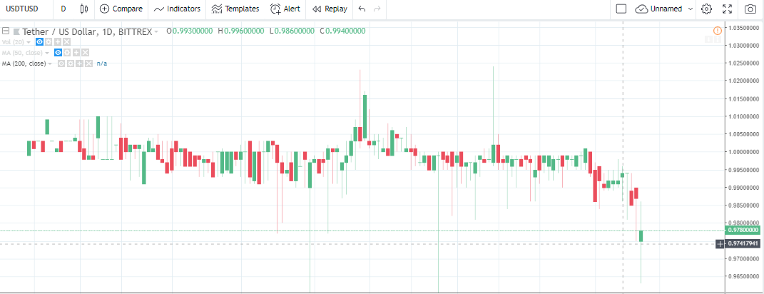 The value of Tether (USDT) also slipped heavily against the USD on the cryptocurrency exchange Bittrex. Tether, most well-known for being a ‘stablecoin’ that remains pegged very near to $1, is currently trading slightly below $0.98.