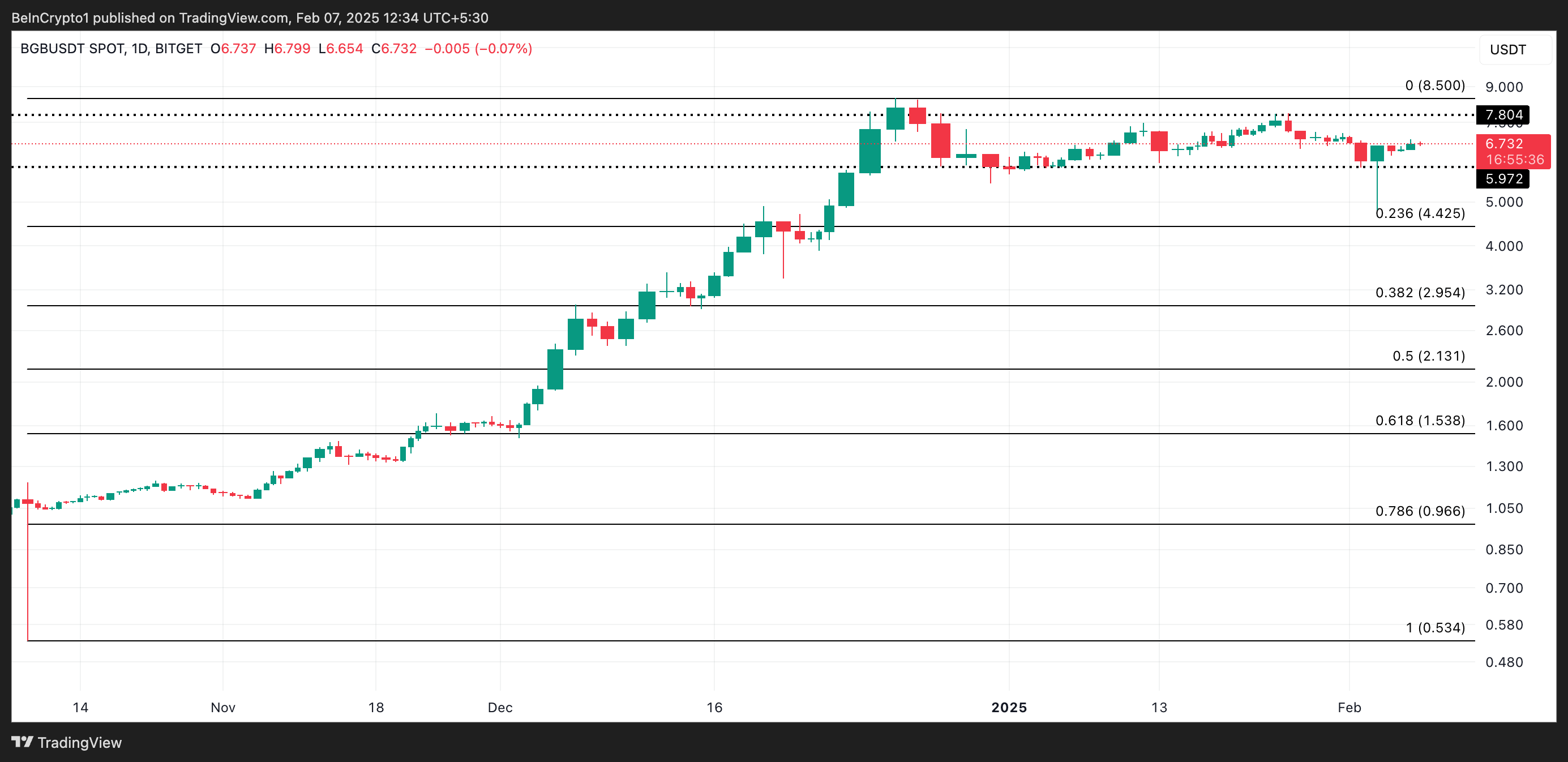 BGB currently exchanges hands at $6.73, trading below the crucial resistance formed at $7.80. Sustained demand for the altcoin could push BGB above this level and propel it toward its all-time high of $8.50.