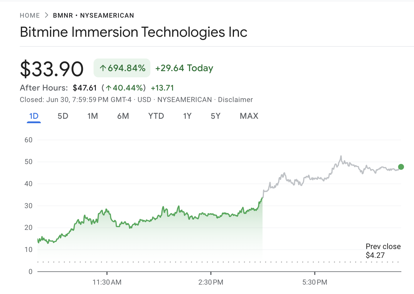 BitMine Immersion Technologies (BMNR), a publicly traded company focused on Bitcoin (BTC) mining, has seen a dramatic 694.8% surge in its stock price following the announcement of its $250 million Ethereum (ETH) treasury strategy.