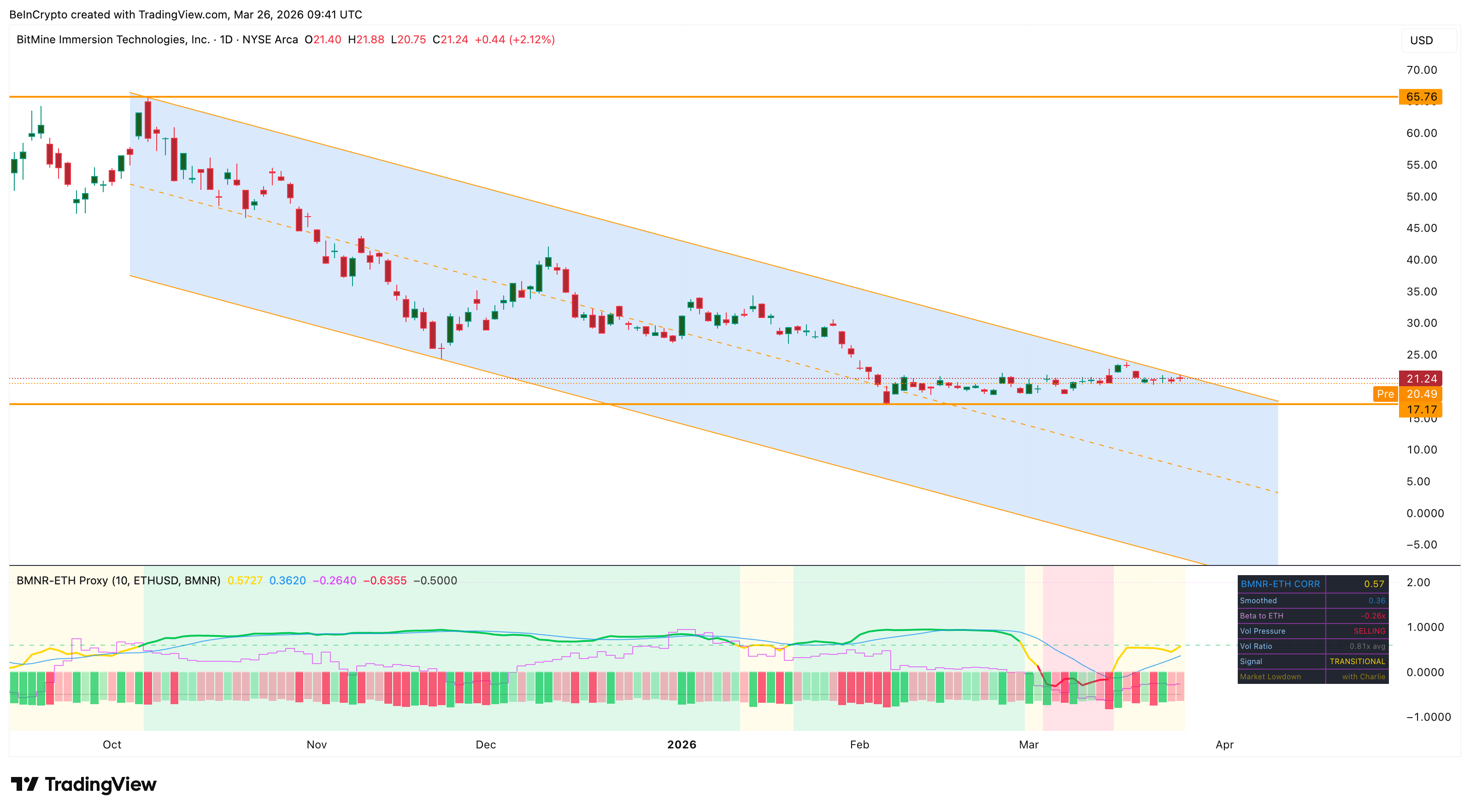 This negative beta explains the monthly performance gap. When ETH rallied 14%, BMNR captured only a fraction of that upside. The stock has been locked inside a descending parallel channel on the daily chart since early October, a 6-month downtrend that has compressed the price from above $65 to the current $21 range, a 68% slide.