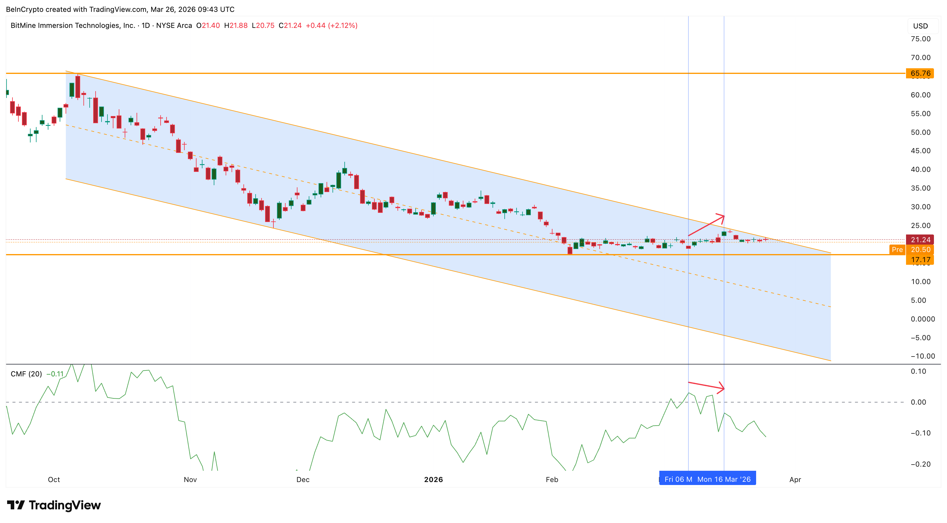 Chaikin Money Flow (CMF), a proxy for institutional buying and selling pressure, sits at -0.11 on the daily chart. That negative reading means institutional capital is flowing out of BMNR rather than in, even as the company adds ETH to its balance sheet every week.