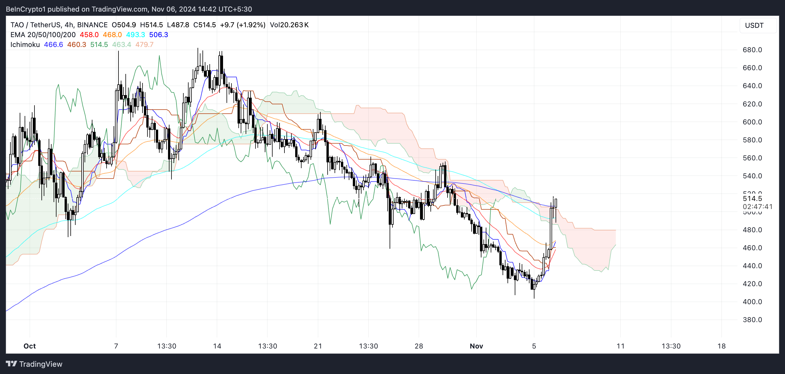 Bittensor (TAO) ‘s price has risen almost 20% in the last 24 hours, and technical indicators hint at potential trend shifts. The Ichimoku Cloud reveals a key resistance zone ahead, with TAO nearing the cloud but needing to break through it to confirm a sustained uptrend.