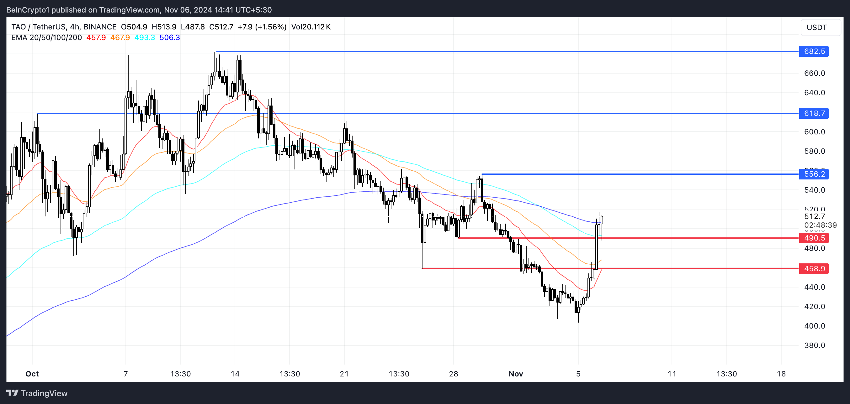 In that scenario, TAO might aim for resistance levels at $556, $618, and even $682, which would present a possible 33% upside if the uptrend strengthens.