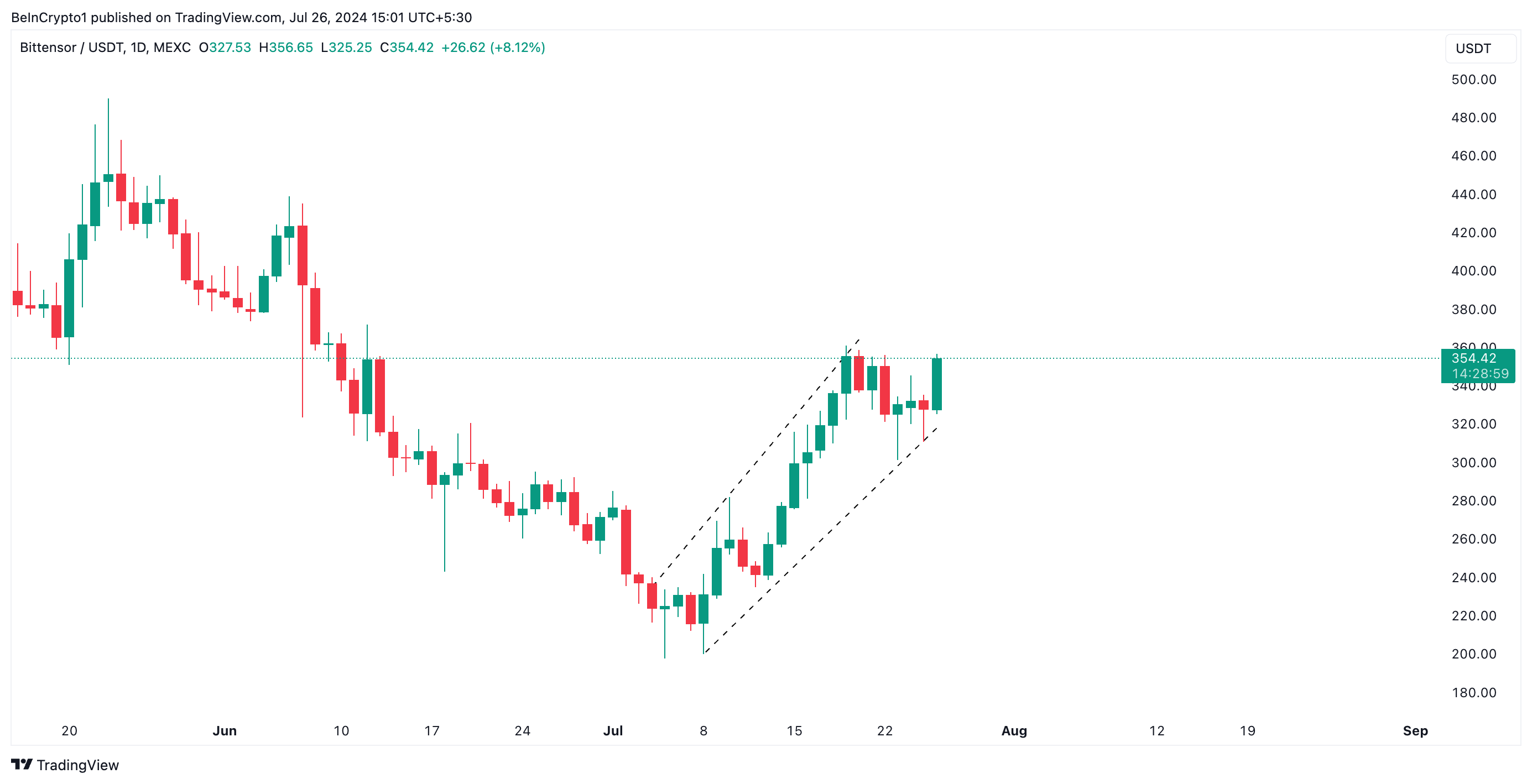 Since July 3, TAO has trended within an ascending channel. This channel is formed when an asset’s price moves between two upward-sloping parallel lines. The upper line of the channel acts as resistance, while the lower line serves as support.