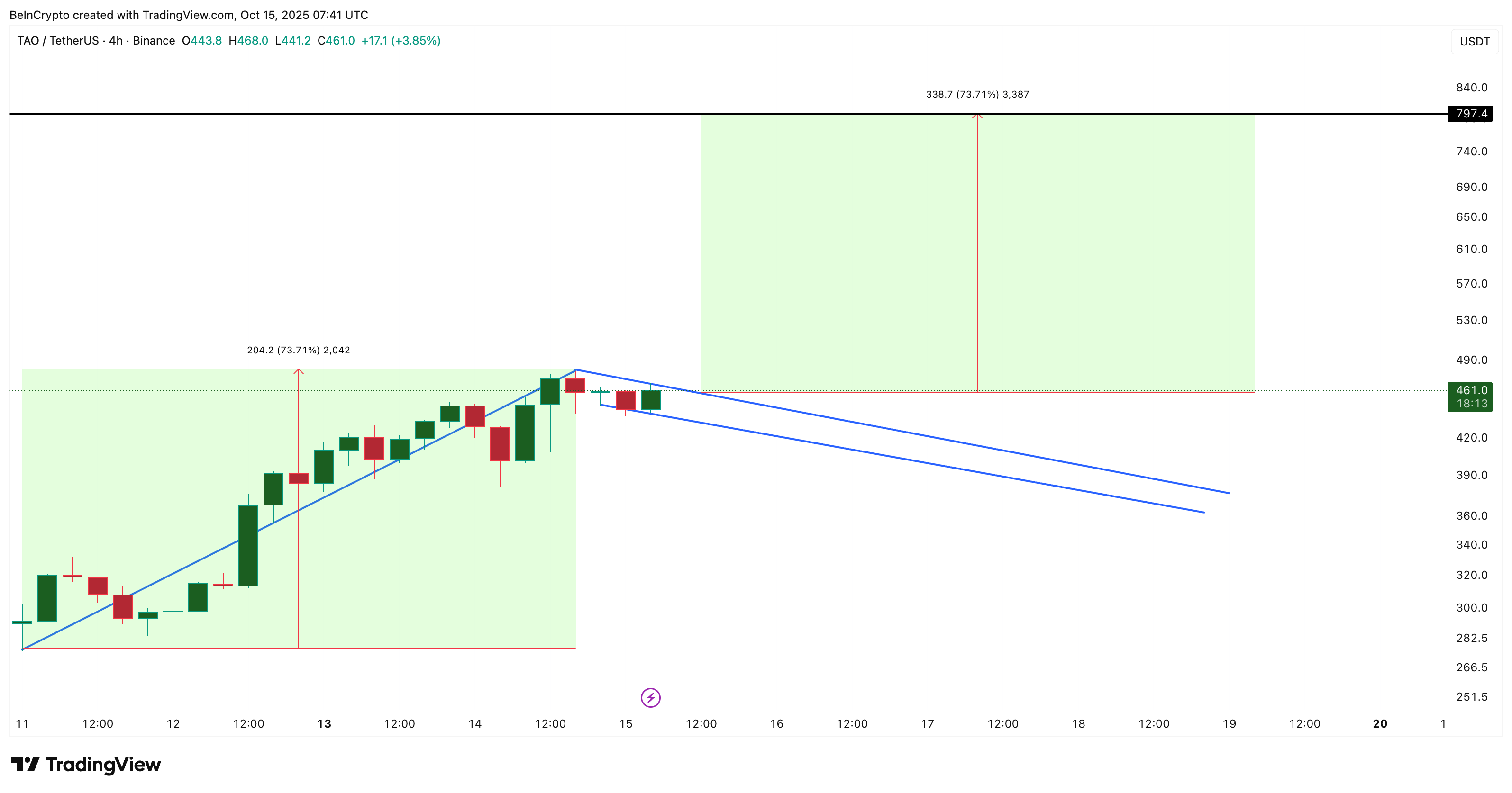 The 4-hour chart shows the Bittensor price forming a bullish flag — a short consolidation after a strong rally. The pole reflects the recent uptrend, while the flag represents the current consolidation before a potential breakout. Based on the pole’s projection, the TAO price might have the potential to hit $797, crossing its previous all-time high.