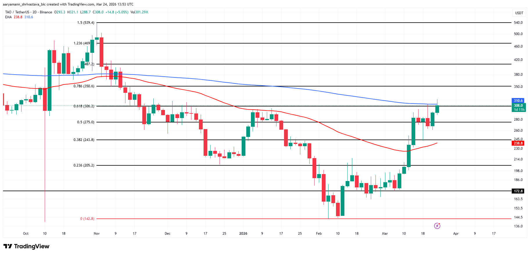 The 2-day chart shows TAO sitting at the Fibonacci 0.618 level of $306 — a level that has served as both support and resistance throughout the chart’s history. The blue EMA at $310 sits immediately above, creating a tight two-level resistance cluster between $306 and $311. Both levels are products of the same downtrend that began in November 2025 from above $469.