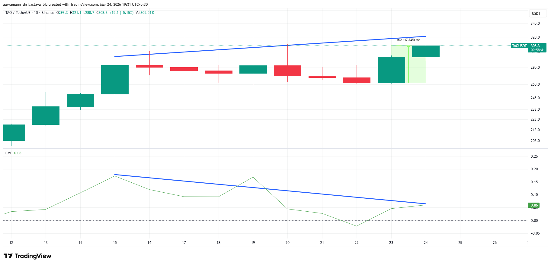 Since then, despite the price climbing from $261 to $308, CMF has declined steadily from +0.20 to the current reading of +0.06. A descending trendline on the CMF connects these lower highs directly, forming a classic bearish divergence against the ascending price trendline. TAO price is making higher highs. Money flow behind each of those highs is weaker than the last.