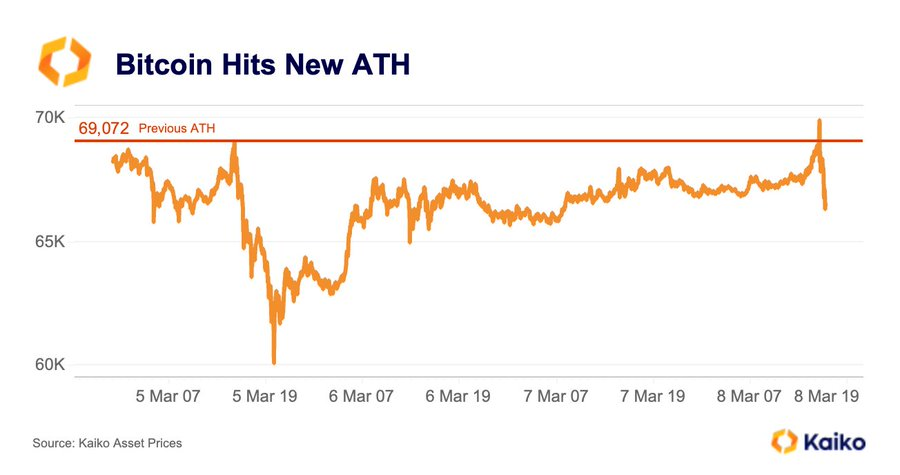 Nonetheless, excitement quickly turned to apprehension as the market witnessed a sharp sell-off reminiscent of crypto’s notorious volatility. According to blockchain analytical firm Kaiko, Bitcoin’s price surged to $69,952 and dropped by nearly 6% to $66,120 shortly after, liquidating millions in long and short positions across multiple crypto exchanges.