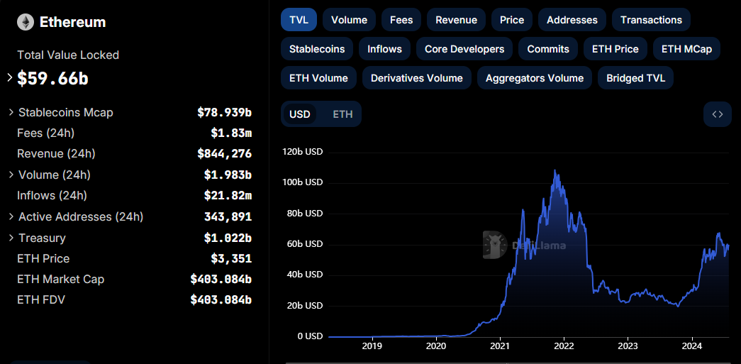 It boasts versatile use cases, including DeFi and NFTs, which sustain its relevance in the crypto space. DefiLlama data shows that the total value locked (TVL) in the Ethereum ecosystem is now $59.66 billion.