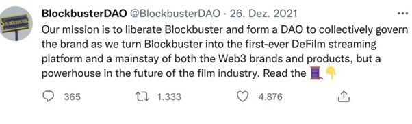 And now such an organization wants to change the streaming business from the ground up. On December 25, 2021, BlockbusterDAO’s Twitter channel announced that its mission is “to liberate Blockbusters and create a DAO to collectively turn Blockbuster into the very first DeFilm streaming platform. The DeFilm streaming platform will be a mainstay of Web3 brands and products, but also a powerhouse for the future of the film industry.”