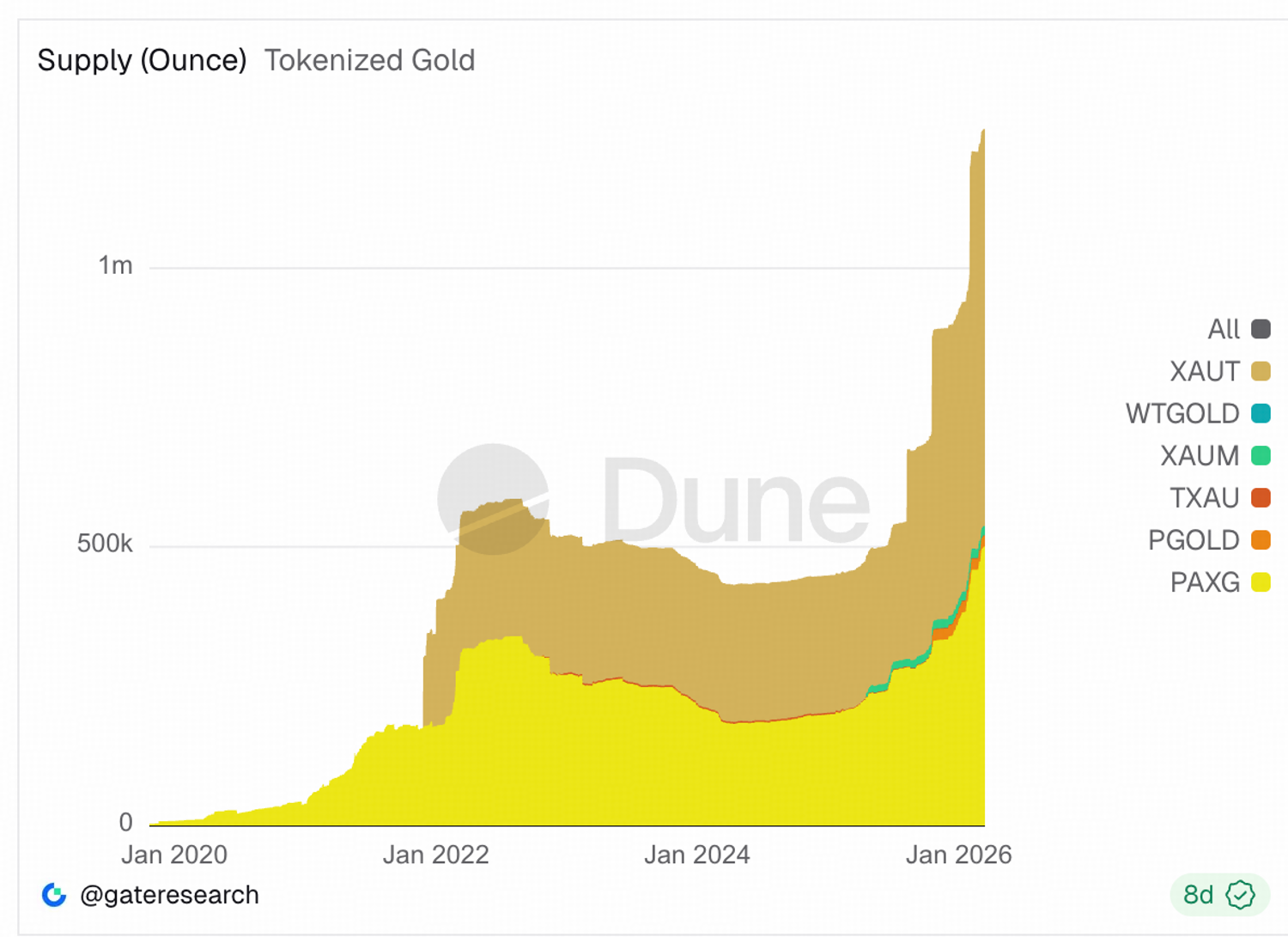 Tokenized gold removes that friction. Anyone with a mobile phone can acquire exposure to physically-backed gold without a bank account, broker, or custodian logistics. The total tokenized gold supply has grown rapidly since late 2025. While the total size remains small at less than 40 tonnes compared to the above-ground gold reserve of approximately 216,265 metric tonnes according to the World Gold Council (2025), the growth rate cannot be neglected. In the past half year, the total supply of tokenized gold has doubled in quantity.