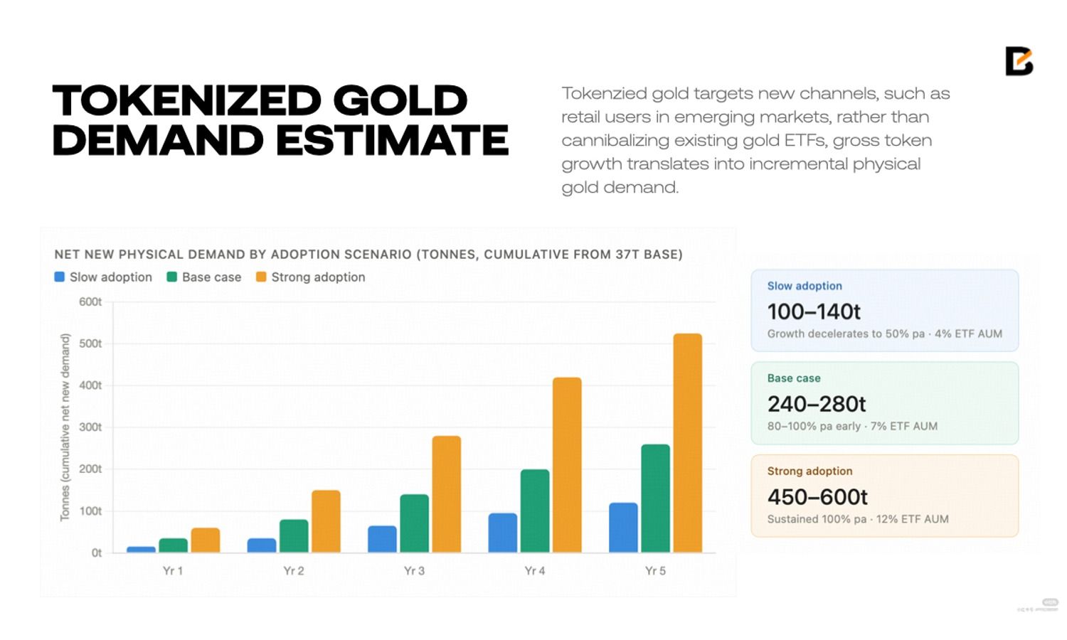 Because tokenzied gold targets new channels, such as retail users in emerging markets, rather than cannibalizing existing gold ETFs, gross token growth translates into incremental physical gold demand.
