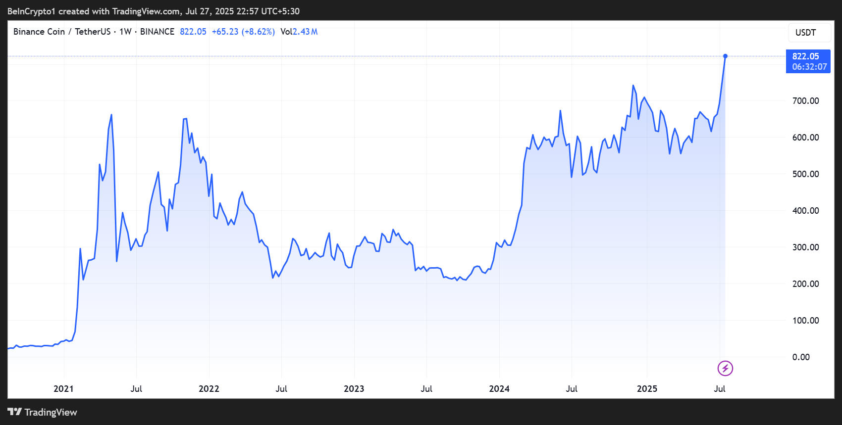 Data on TradingView shows that BNB’s price reached a new ATH of $827.25 on Sunday, July 27. The BeInCrypto price index indicates that BNB is the biggest gainer among the top 20 cryptocurrencies. As of this writing, BNB was trading for $822.05, registering a modest pull-back.