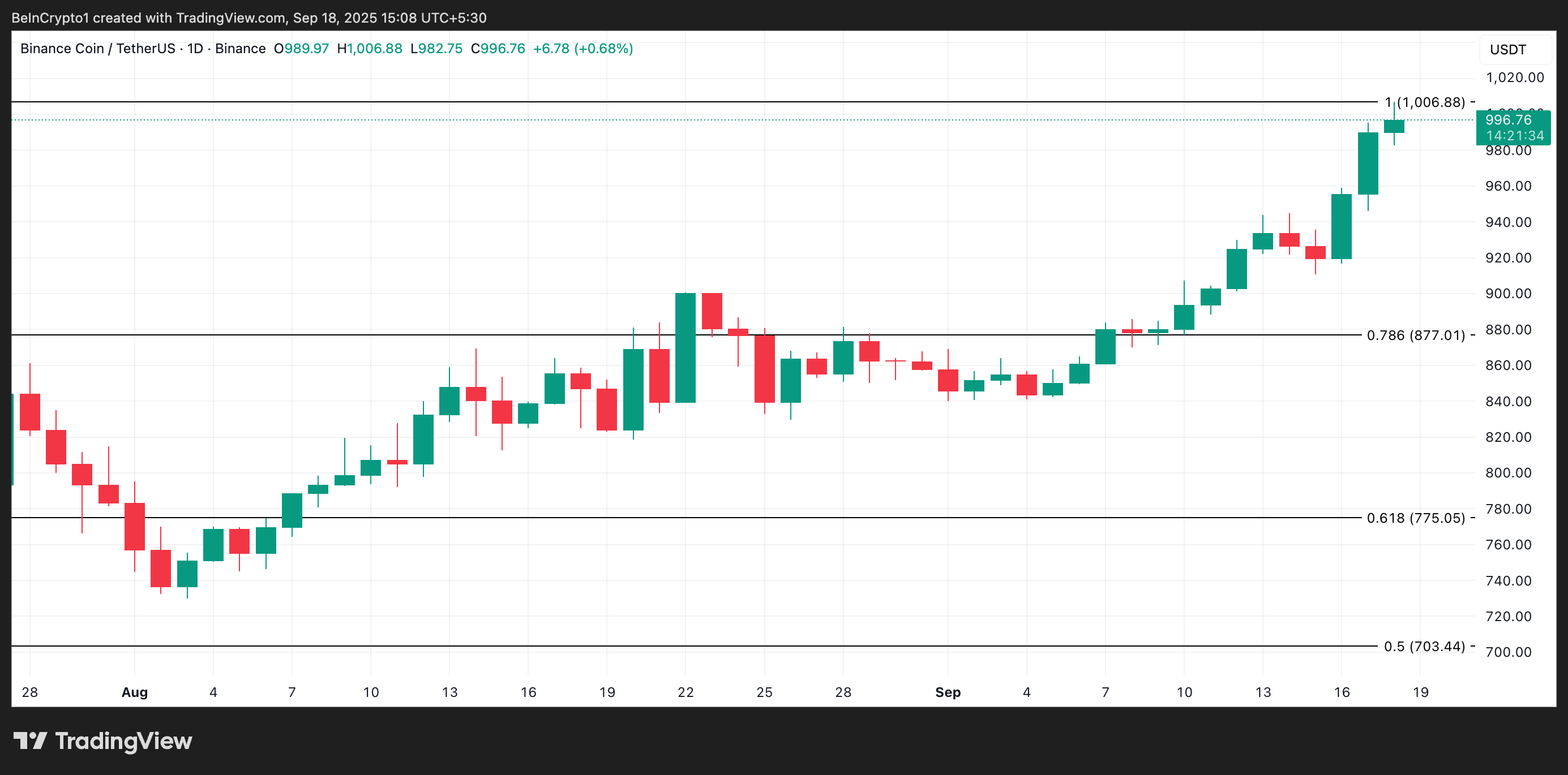 BNB-Chain’s native token, BNB, has crossed the $1,000 mark for the first time since its launch in 2017, marking a major milestone for the cryptocurrency. The surge comes on the back of sustained demand, with the token gaining nearly 15% over the past week.
