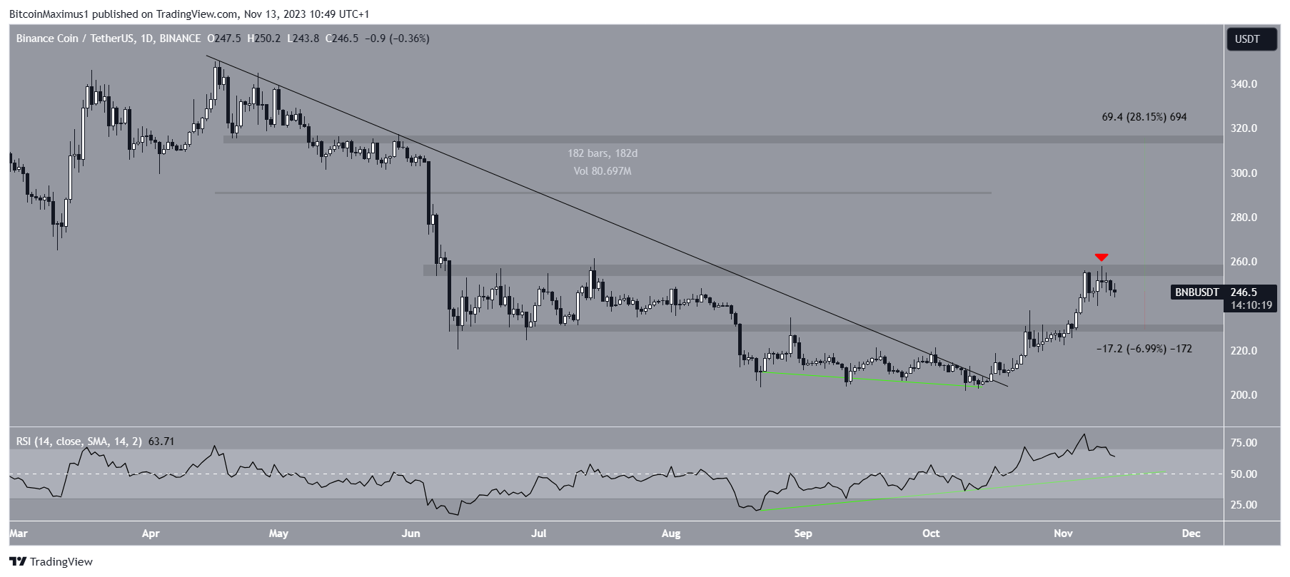 If the BNB price breaks out from the trend line, it can increase by 35% and reach the next resistance at $350.