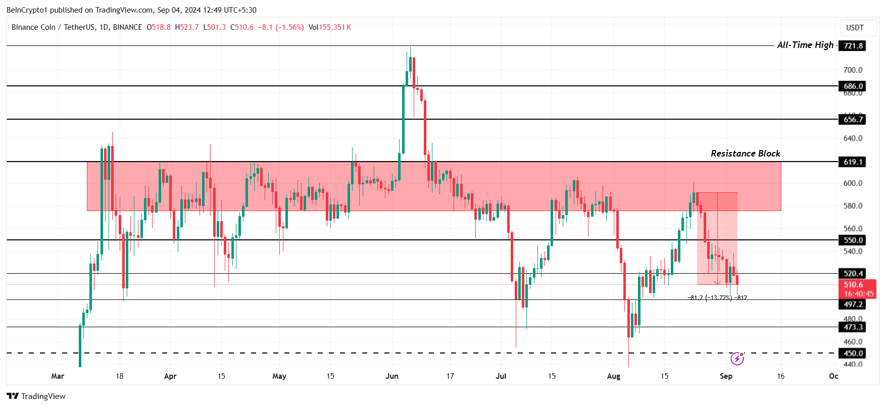 However, if BNB fails to overcome the $520 resistance, it may continue to consolidate within the current range. A failure to breach this level could dampen investor optimism and lead to further declines. Losing the $497 support would be particularly detrimental, potentially invalidating the bullish thesis and signaling deeper losses.