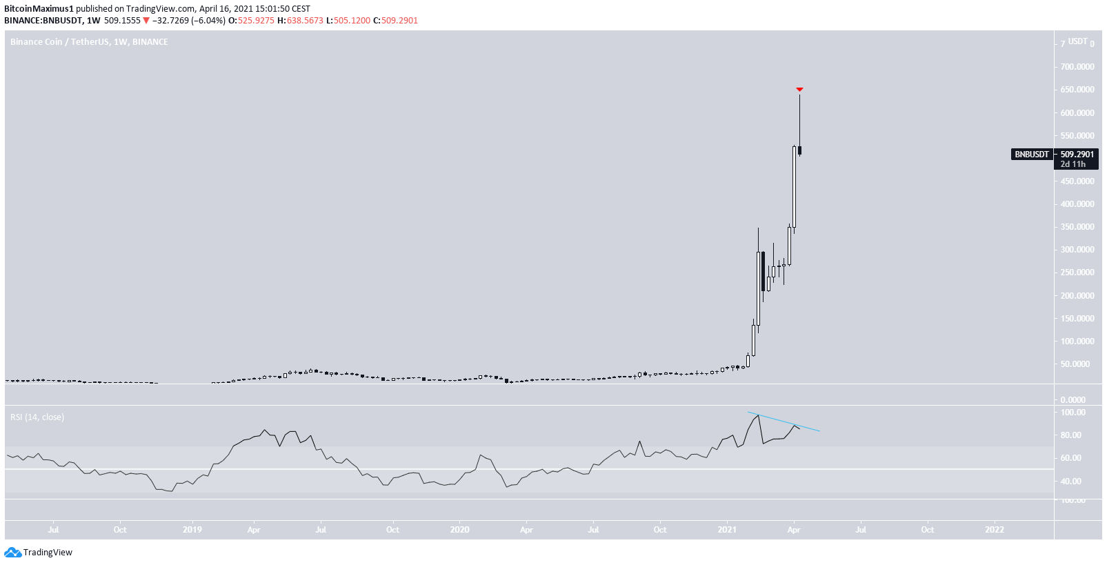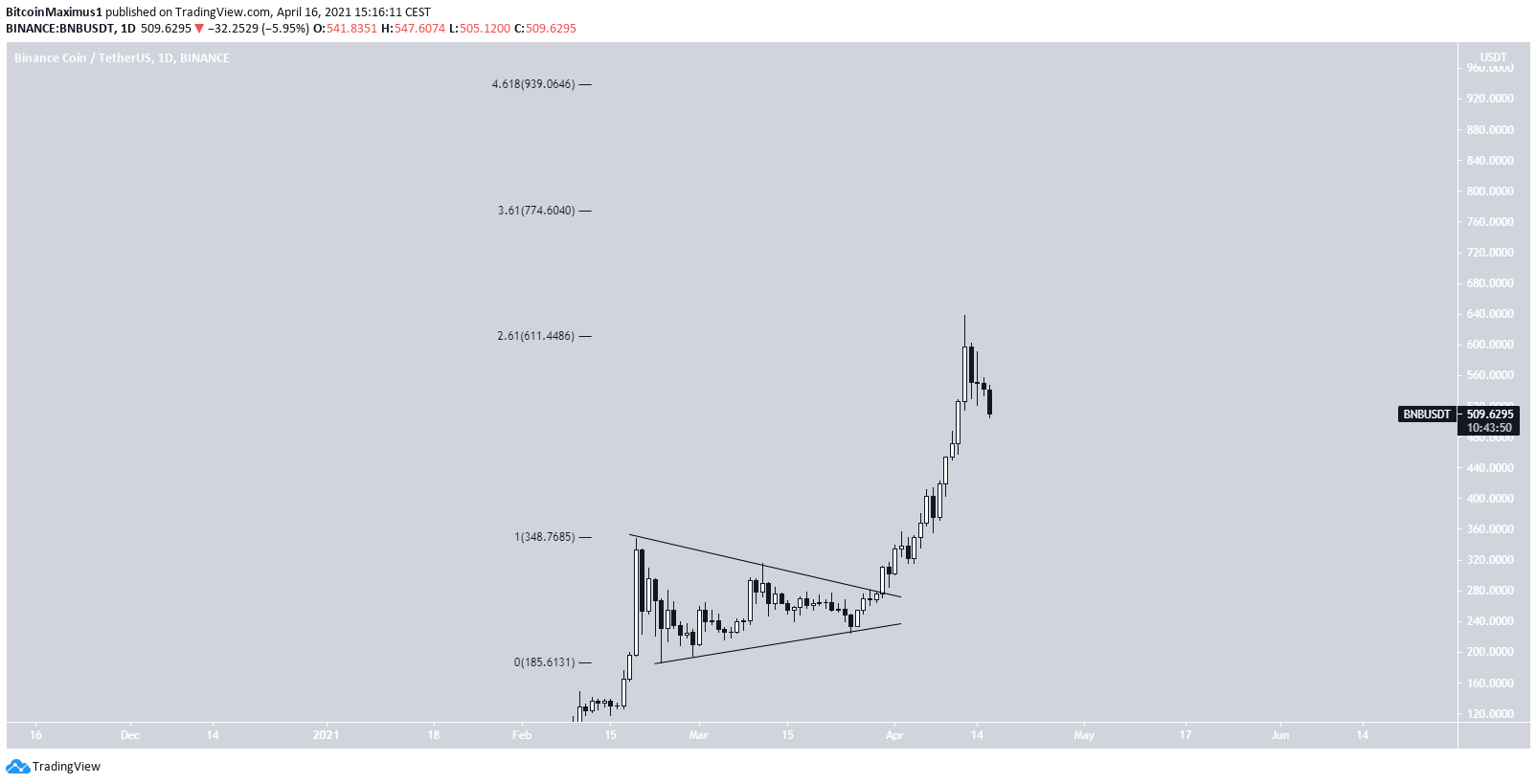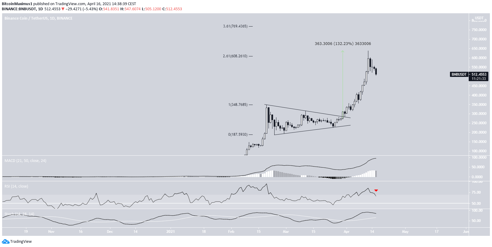 On April 10, it reached a new all-time high price of $638.5. This measured an increase of 132% from the breakout level. BNB has been moving downwards since.