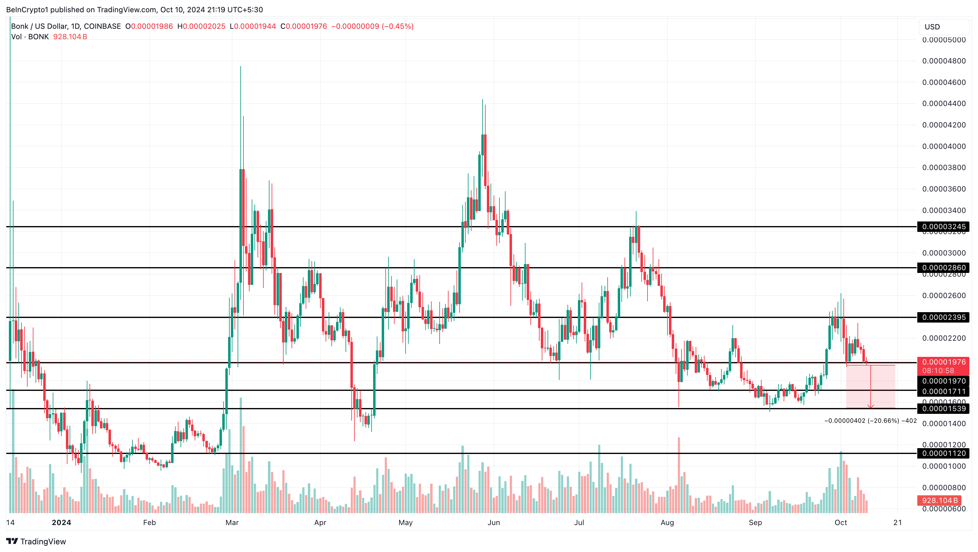 Bonk (BONK), the Solana-based meme coin, faces the risk of further price decline after dropping from $0.000025 to its current value of $0.000019.
