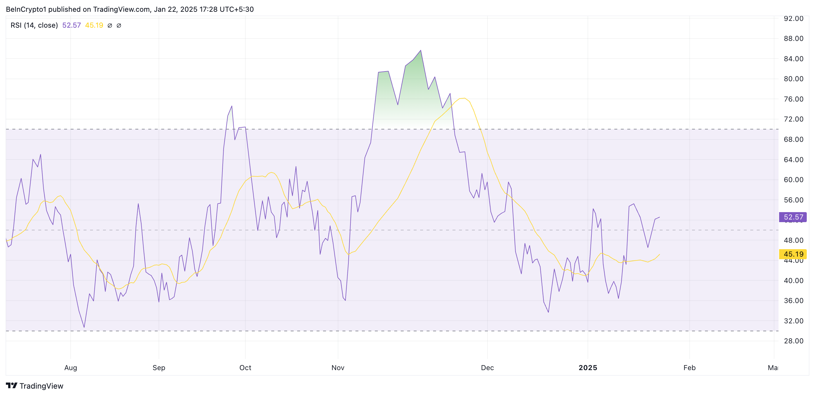 This momentum indicator monitors an asset’s overbought and oversold conditions. Configured this way, it highlights increasing bullish momentum, suggesting the asset is trending toward stronger buying conditions without reaching an overbought state.