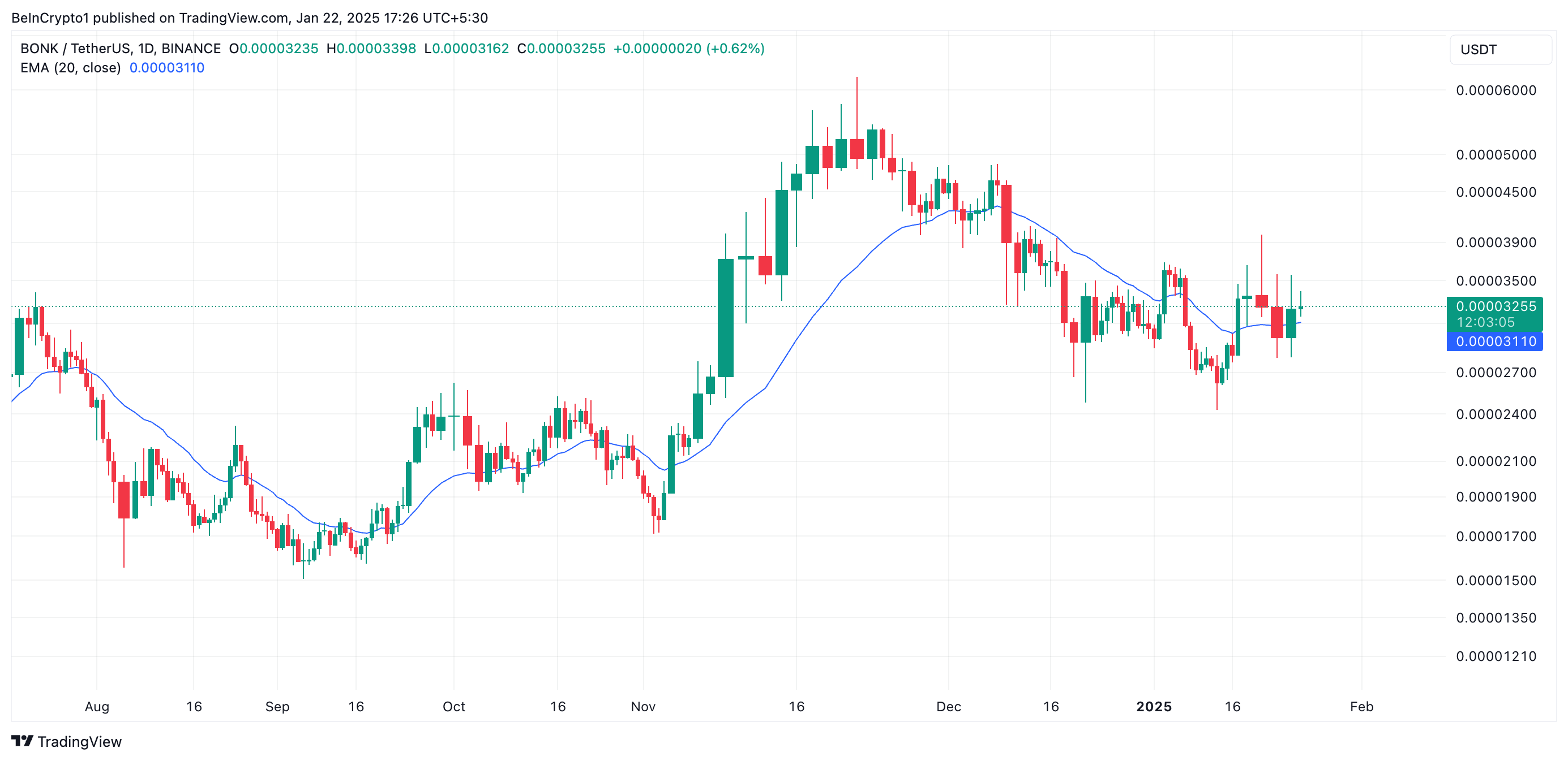 An assessment of the BONK/USD one-day chart shows that this double-digit rally has pushed the meme coin’s price above its 20-day exponential moving average (EMA), which now forms dynamic support.