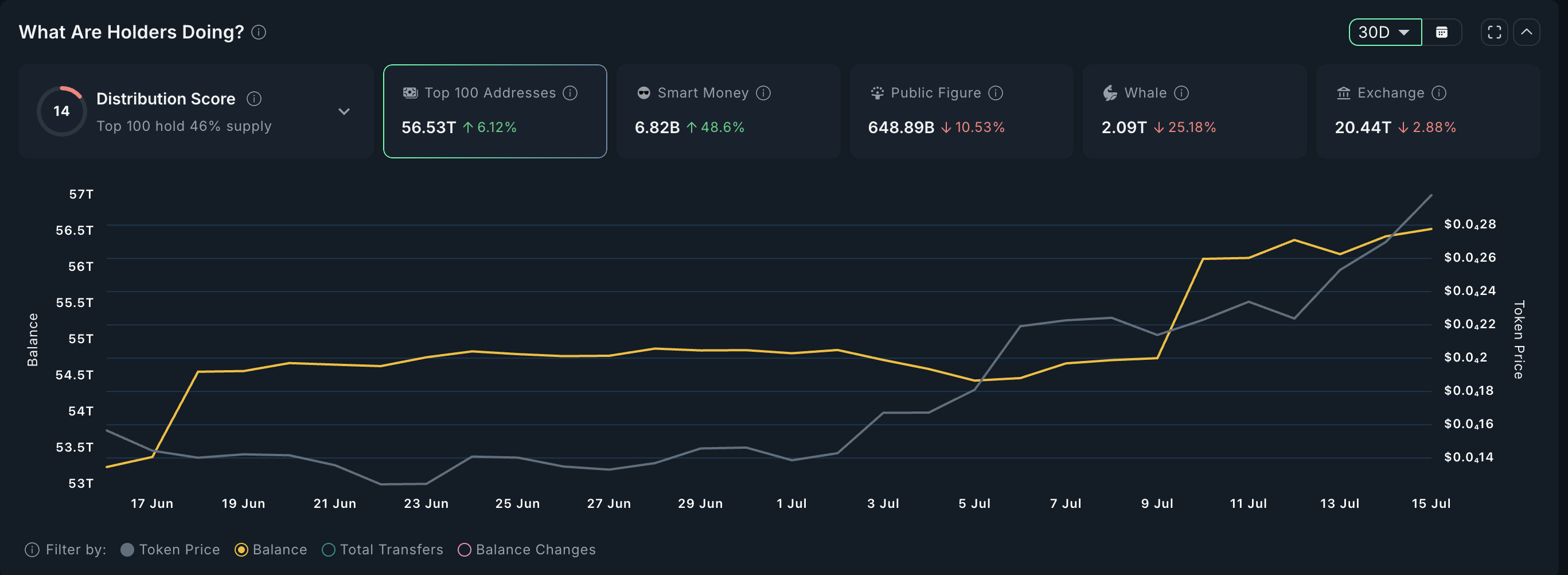 Supporting this, the top 100 addresses now hold 56.53 trillion BONK, up 6.12% over the month. “Smart money” wallets have surged 48.6%, while exchange balances and whale wallets have shrunk, confirming an internal rotation of supply into stronger hands.