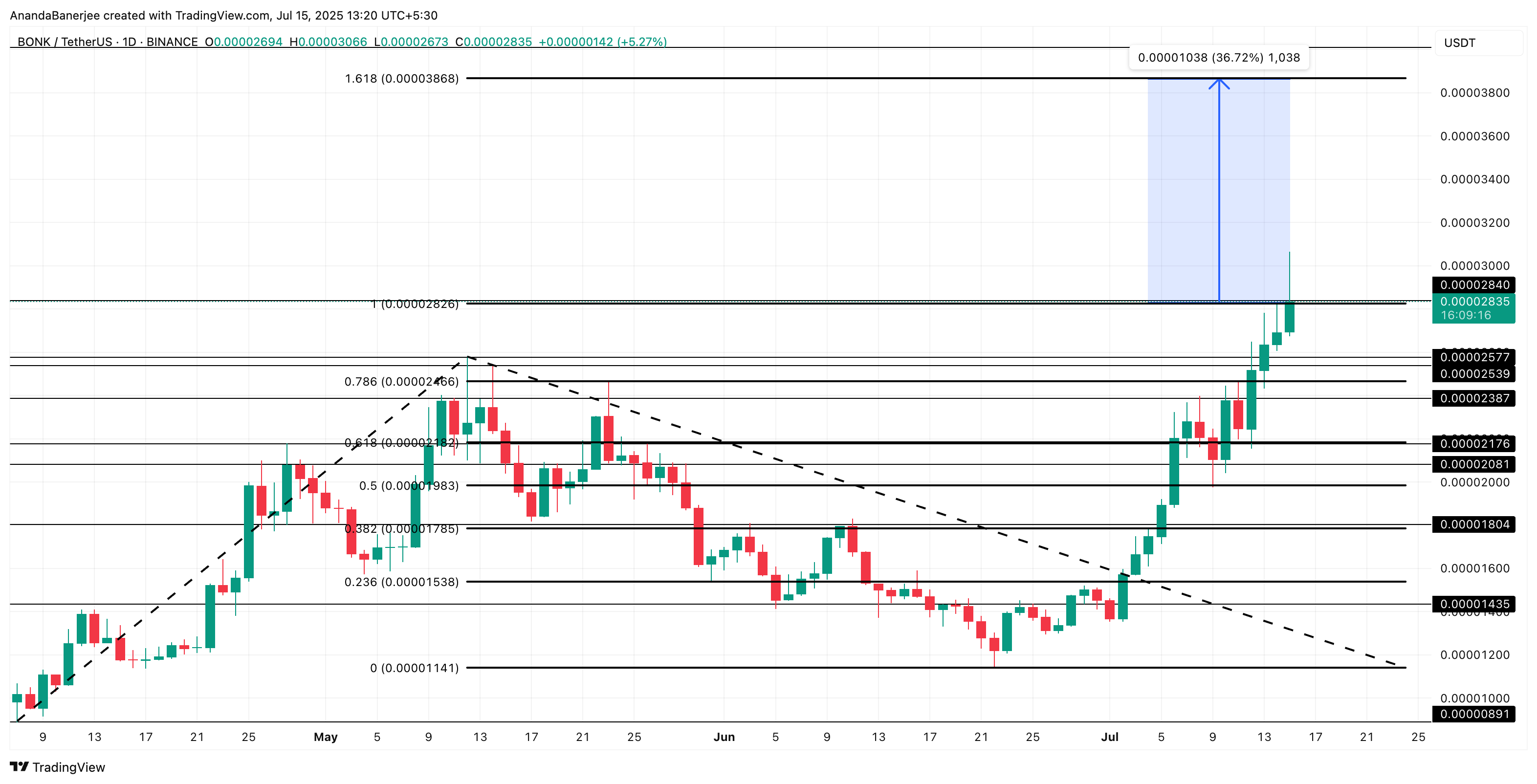 BONK price has broken past multiple Fibonacci extension levels, with the 1.0 level at 0.00002826 now acting as key support. The current price sits around 0.00002835, and the next resistance zone, marked by the 1.618 Fibonacci extension, lies at 0.00003868; a potential 37% gain from current levels.