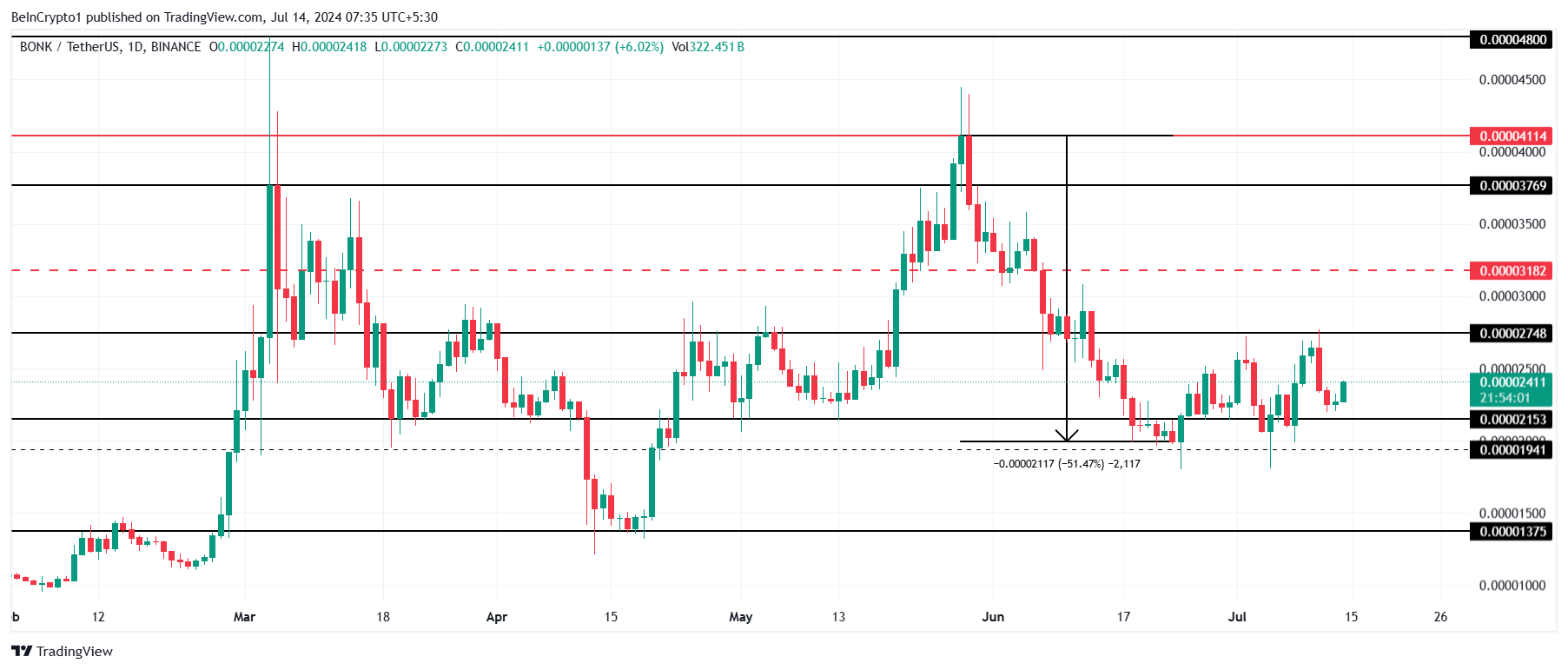 BONK’s price is struggling to find footing above $0.00002500, which would help the meme coin breach through the next barrier.