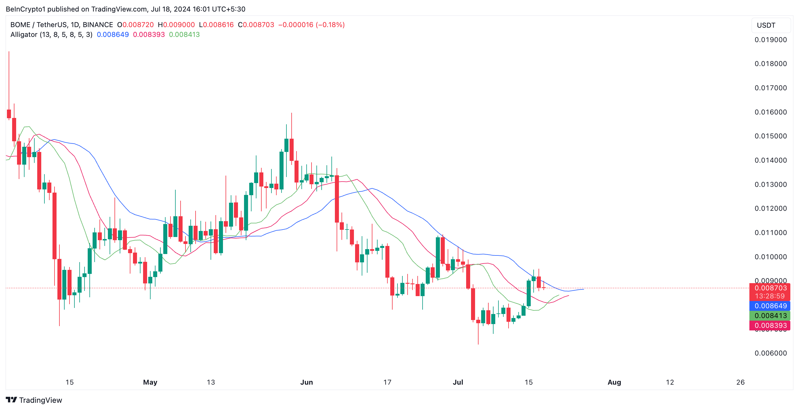 A major confirmation of the growing bullish bias is the setup of BOME’s Alligator Indicator. This indicator tracks an asset’s market trends and identifies its potential price reversal points.