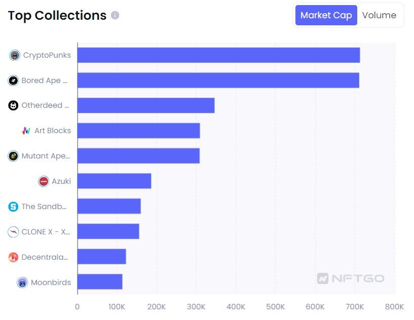 Meanwhile, according to NFTGo, CryptoPunks continues to be the leading NFT collection in terms of market cap, but Bored Ape Yacht Club is a close second.