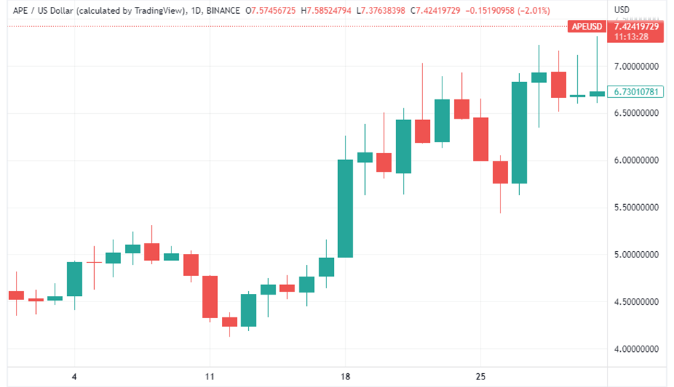 APE opened on July 1, with a trading price of $4.63, reached a monthly high of $7.26, tested a monthly low of $4.20, and closed at $6.72.Â