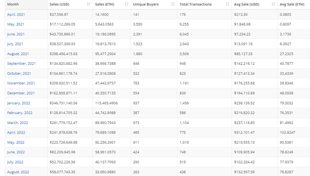 A further drop in unique buyers to 290 in July and then 263 in August has led to sales falling below $60 million in the past two months. August 2022’s volume was approximately $58 million.