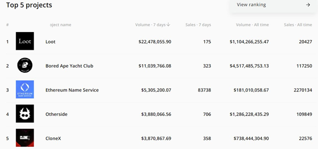Bored Ape Yacht Club trailed only Loot, a collection of 8,000 NFTs expressed as images of white text on a black background in the highest selling NFT category in the last seven days. BAYC had sales of approximately $11 million within the period. Ethereum Name Service, Otherside, and CloneX also filled out the ranks.