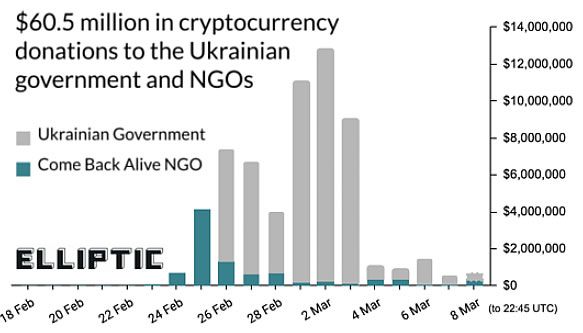 However, the total amount in crypto donations is much higher than that. Blockchain data firm Elliptic has been tracking the total donations sent to Ukraine since the Russian invasion began on Feb. 24.