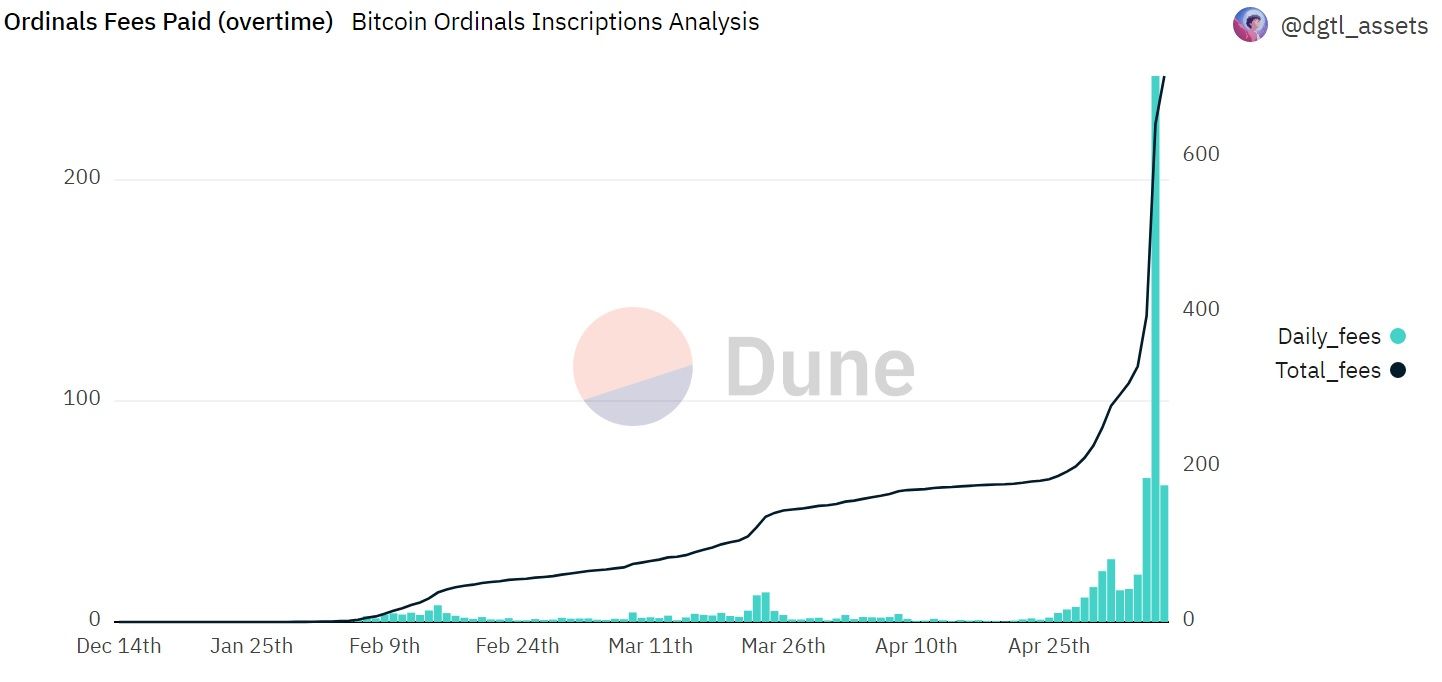 Daily minting fees on BRC-20 reached a record high of 247 BTC on May 7, as seen on Dune. The total fee for these Bitcoin Ordinals was 641 BTC. The chart shows a significant peaking for these fees in late April, which was around the time when Bitcoin daily transactions reached an all-time high because of Ordinals.