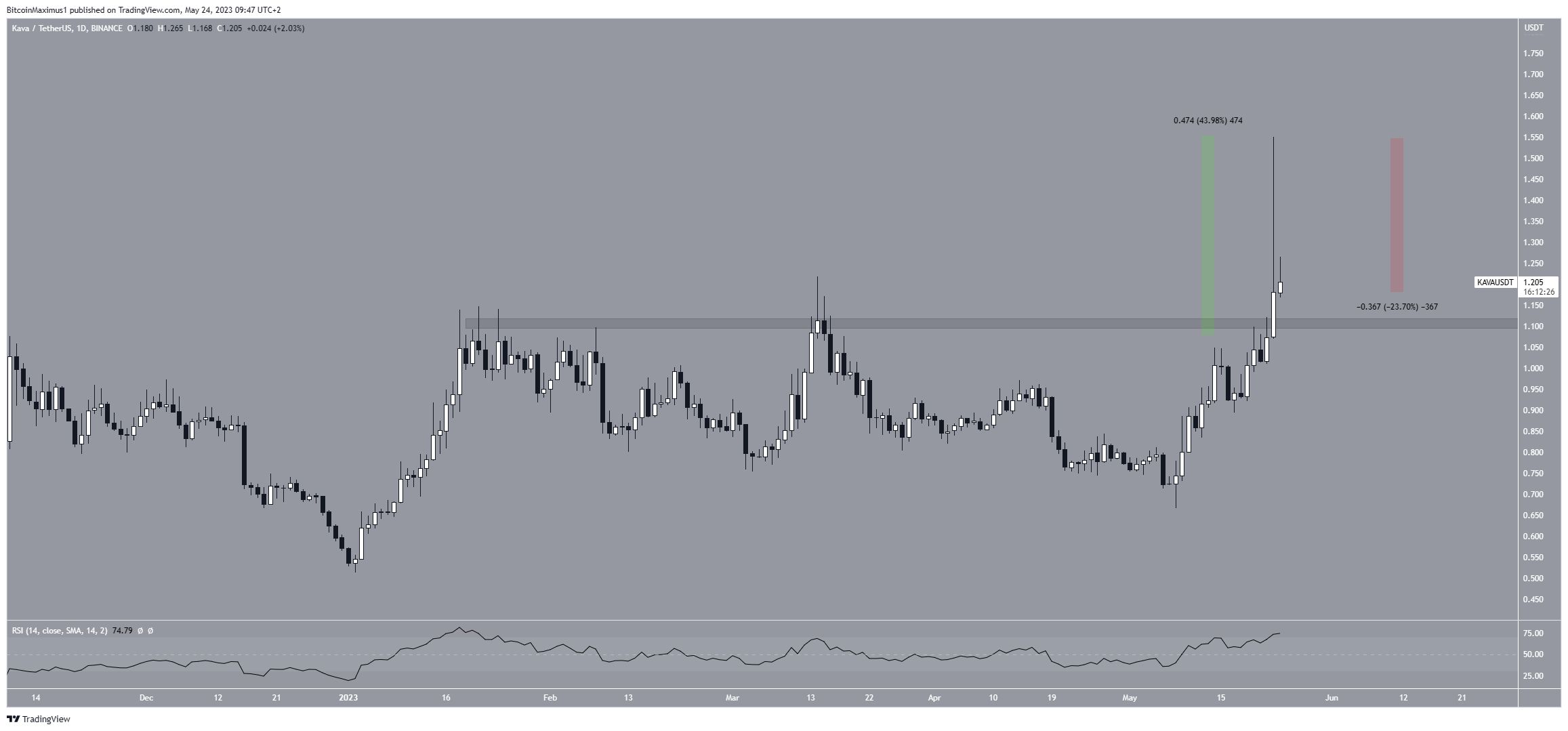 The KAVA (KAVA) price has cleared an important horizontal support area, leading to a 40% increase on May 23.
