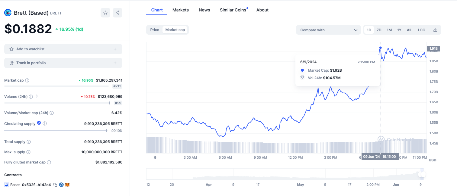 Over the past 30 days, the meme coin’s value has surged by nearly 445%. This price surge boosted BRETT’s market presence, propelling its market capitalization from $1.66 billion to $1.92 billion in just two hours.