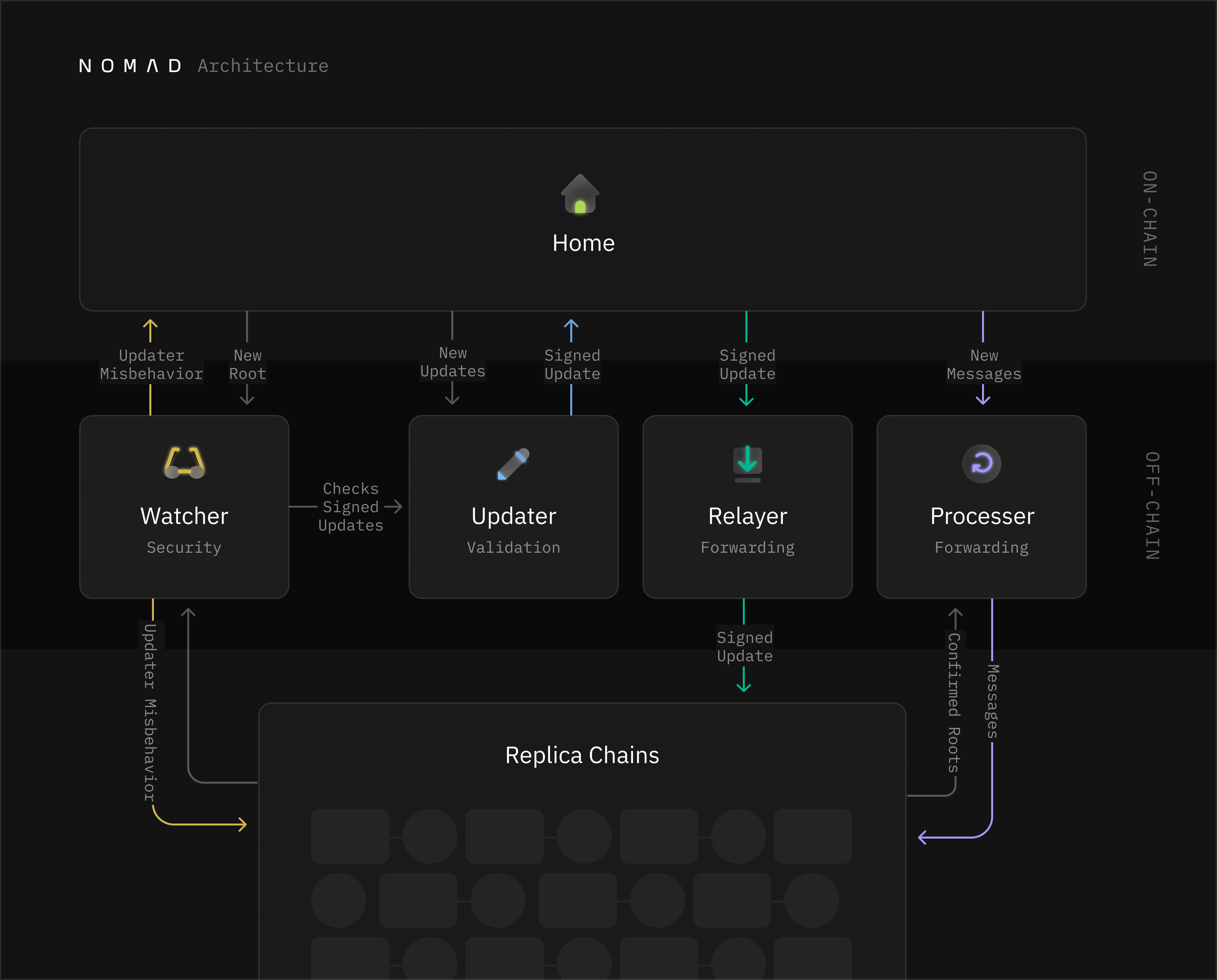 Within this timeframe, data on Nomad is essentially cycled between an Updater, who signs and uploads the data to the origin chain; and a Watcher, who detects and reacts to faulty attestations.
