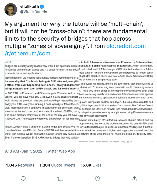 Vitalik had pioneered and floated this perspective in January this year, citing “fundamental security limits of bridges,” and that cross-chain bridges should be regarded as an interim solution to advancing chain interoperability.
