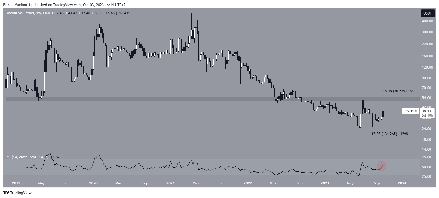 The daily timeframe for BSV shows a significant increase. This bullishness is not validated by the longer-term weekly timeframe. The main reason for this is that the cryptocurrency still trades well below the $50 horizontal resistance area.