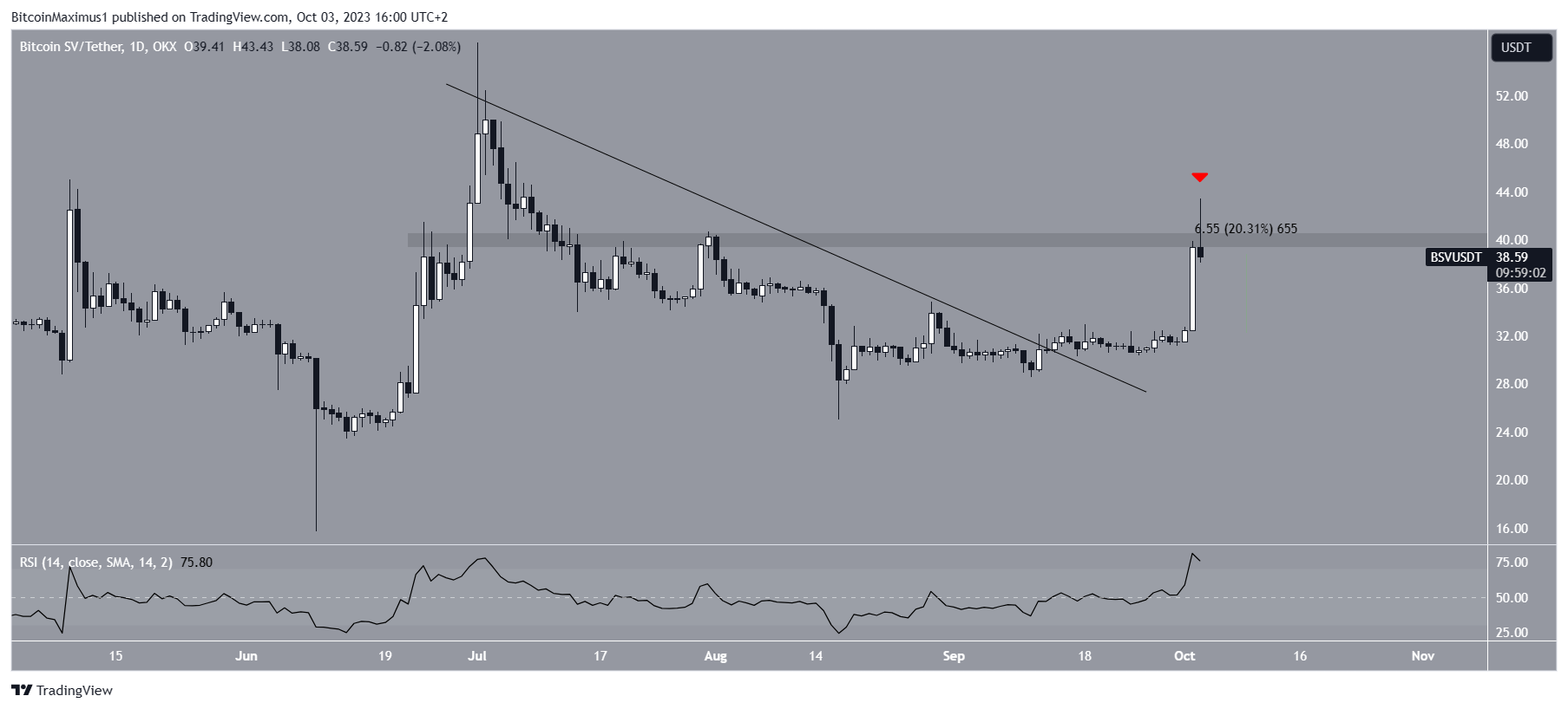 The Bitcoin SV (BSV) price broke out from a descending resistance trendline and increased by 20% on October 2.
