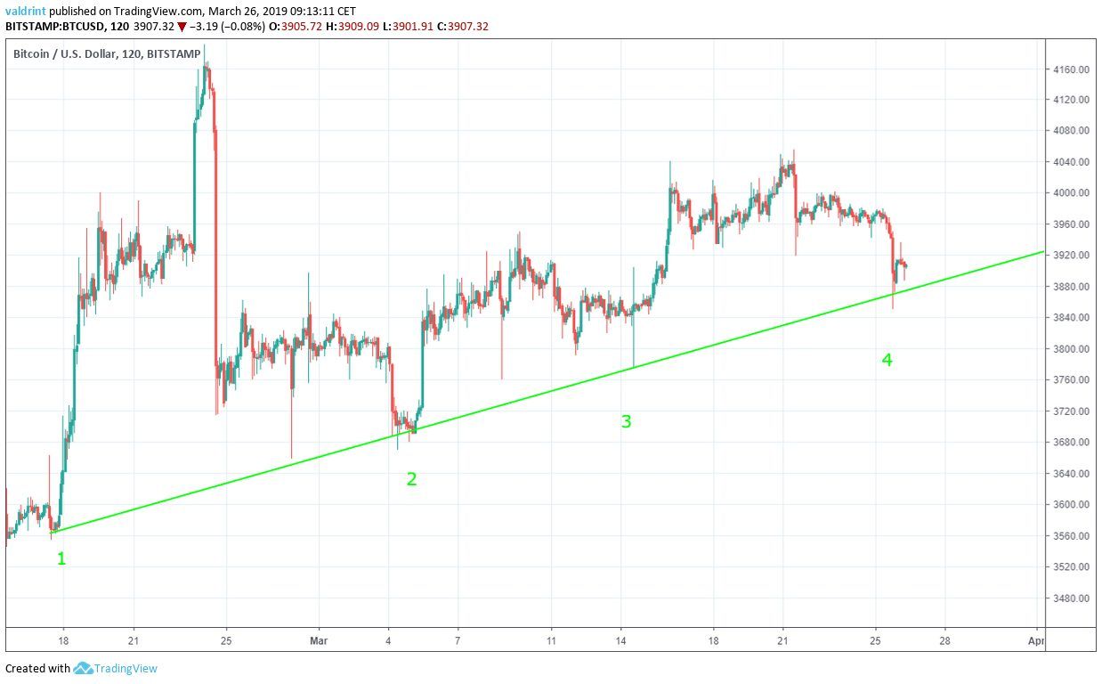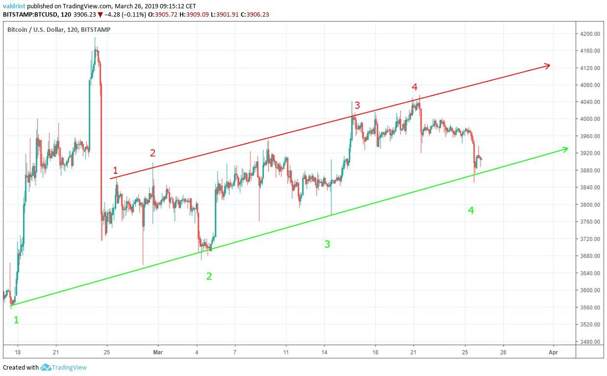 A breakdown from the channel occurred on Mar 25 as we had predicted. A rapid price loss led Bitcoin to a low of $3850 for the day.