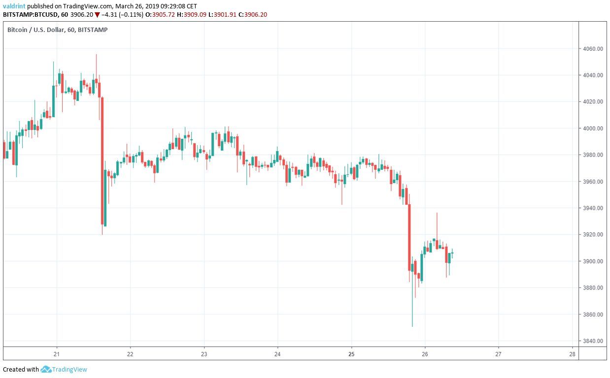 On March 21, 2019, Bitcoin (BTC) made a high of $4055. A sharp drop brought prices to under $3920 hours later.