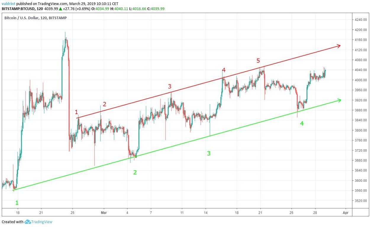 The price of BTC on BitStamp is analyzed at two-hour intervals from Feb 17 to Mar 29 to determine Bitcoin’s current trading pattern.