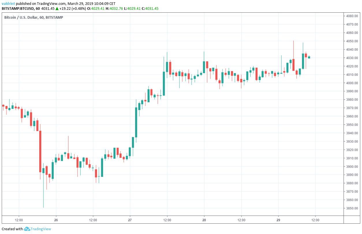 A high of $4036 was reached three times between Mar 27 and 29. At the time of writing on Mar 29, Bitcoin was trading around $4030.