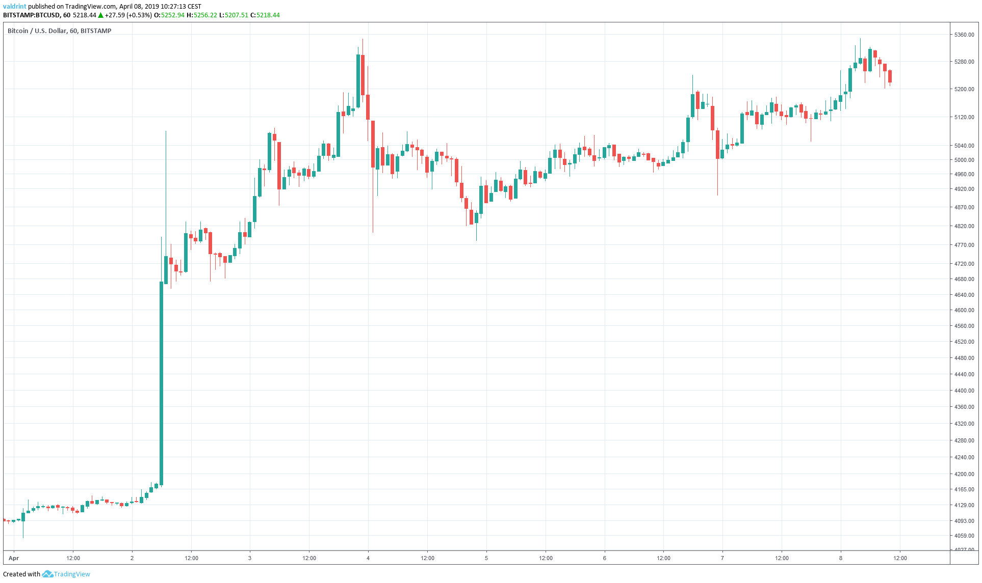 On Apr 2, 2019, the price of Bitcoin (BTC) spiked from $4169.17 to $4790 within an hour. The following day prices reached a high of $5345.