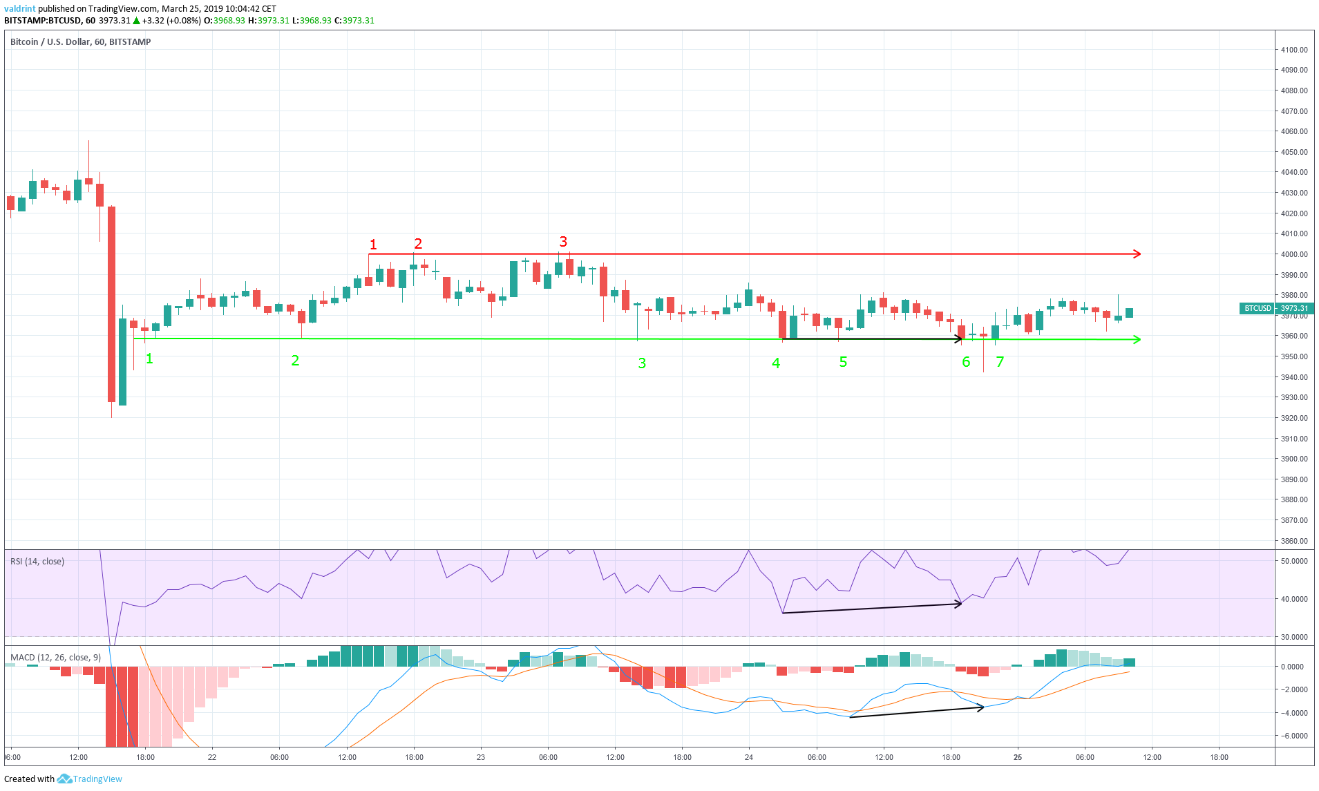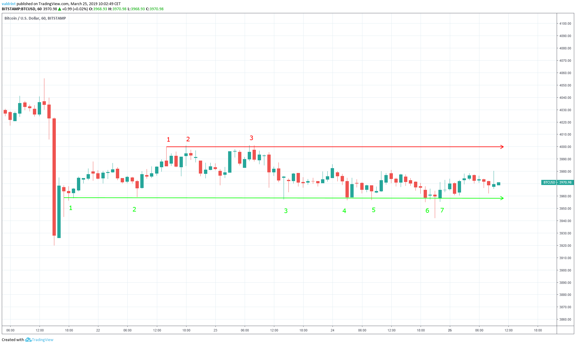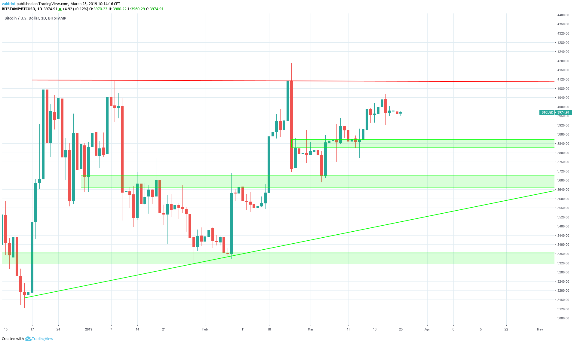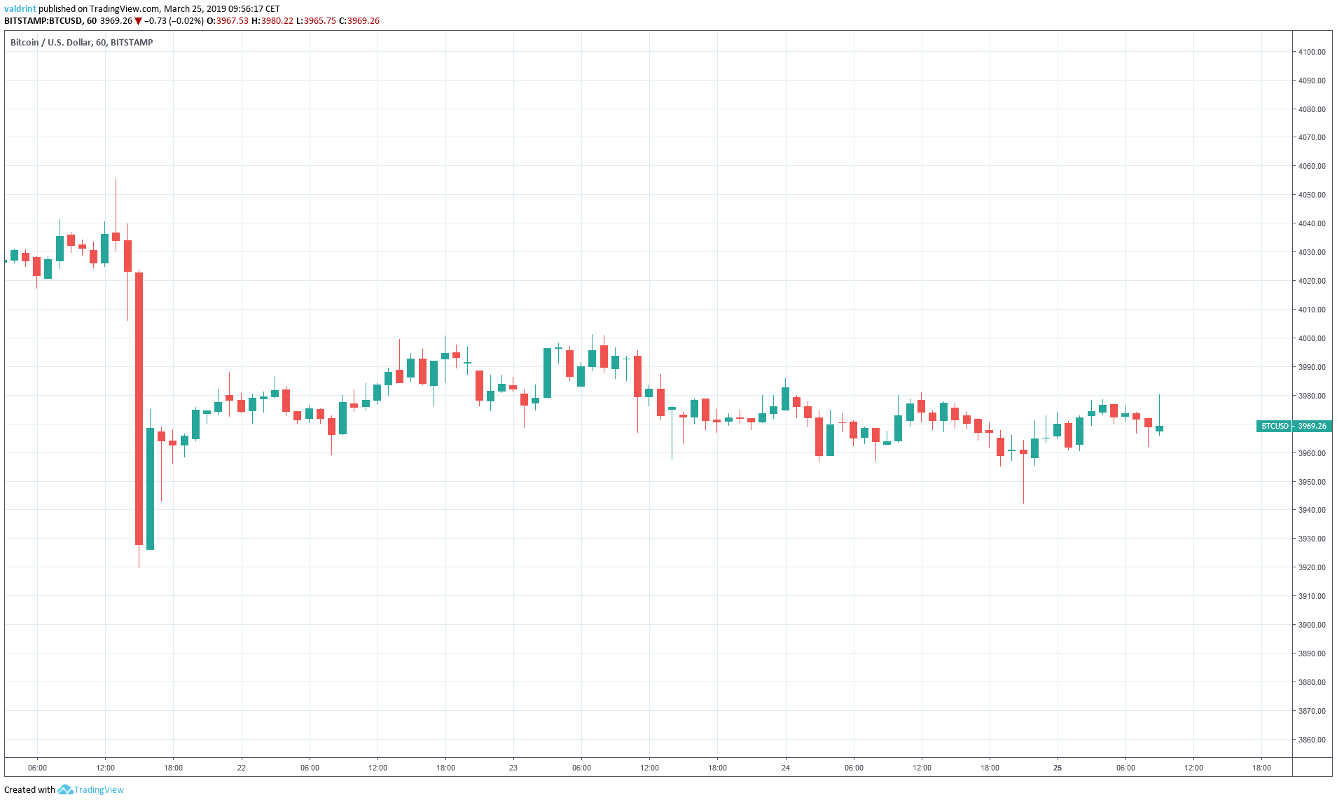 On March 21, 2019, Bitcoin (BTC) made a high of $4055 before a sharp drop took it to a low of $3919 in a matter of hours. It has been trading between these two values since, without experiencing significant volatility.