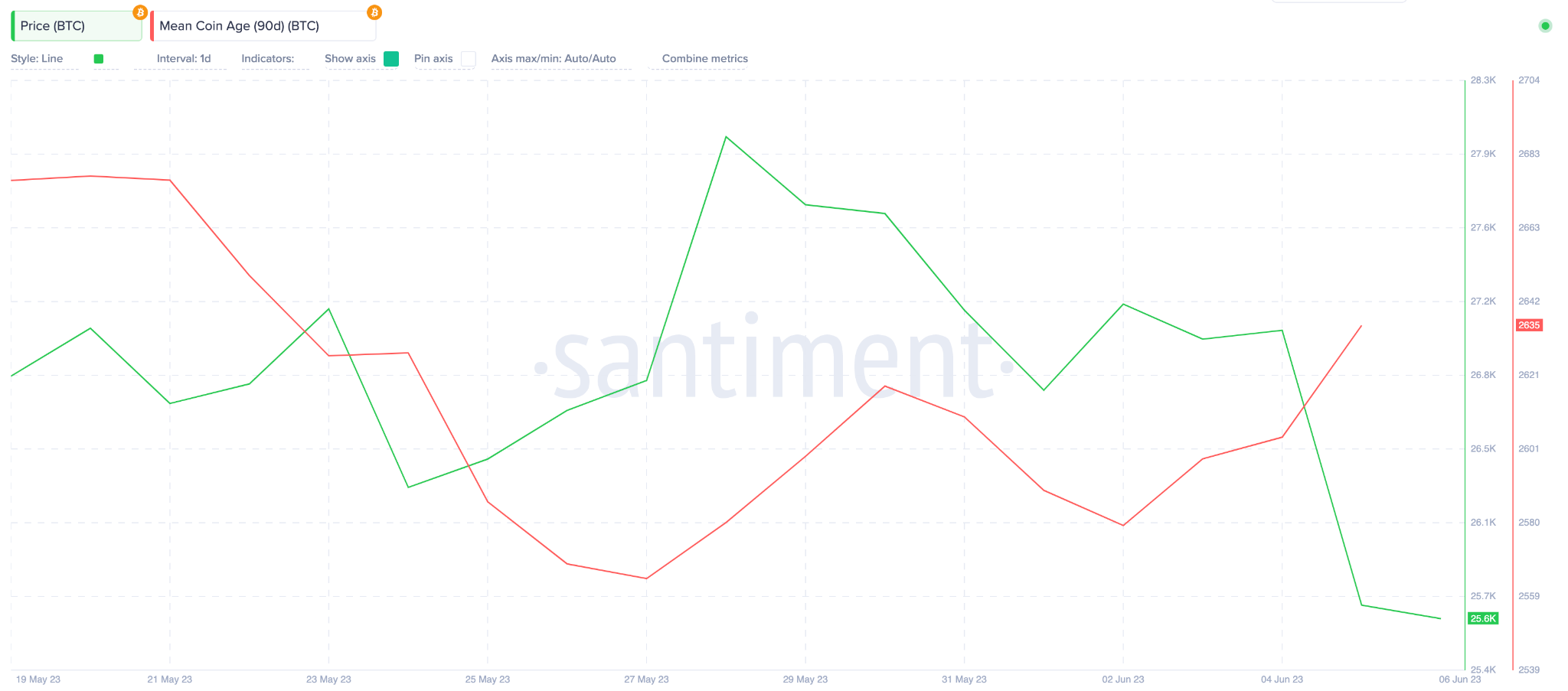 Between June 2 and June 6, BTC Mean Coin Age is now up 2% from 2,579 to 2,635