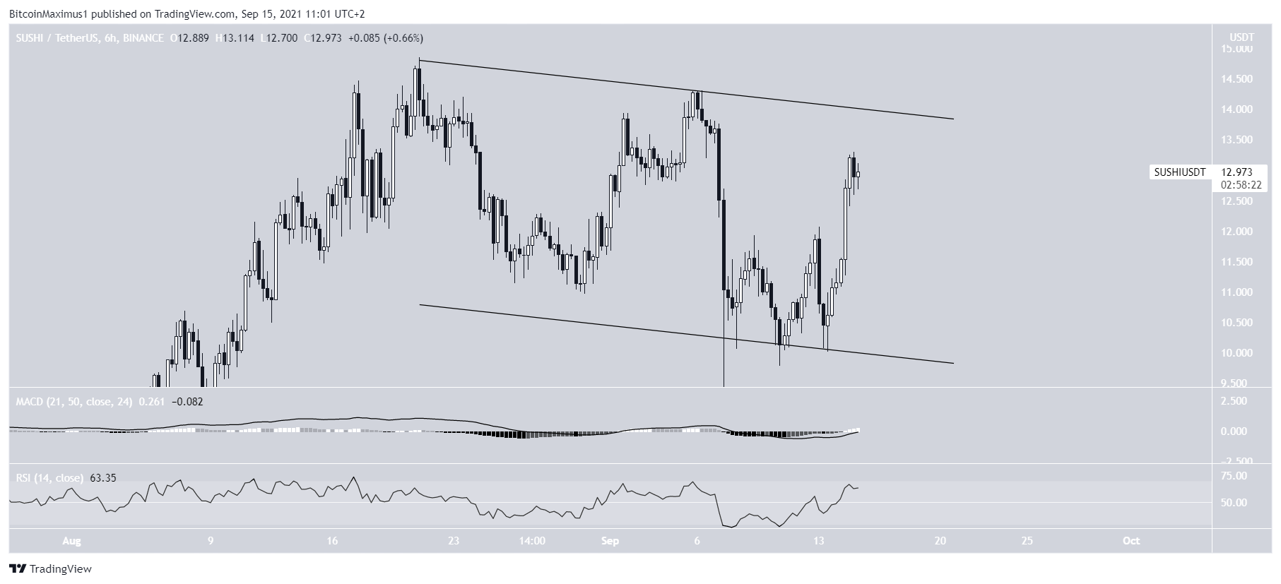 Similar to ETH, SUSHI is trading inside a descending parallel channel since Aug 21.