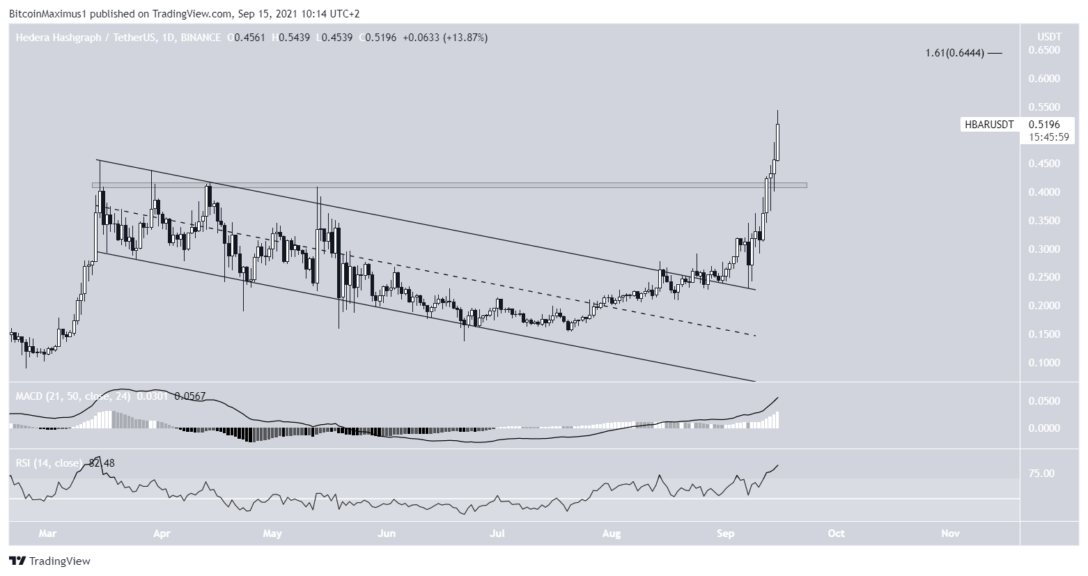 HBAR has been increasing since breaking out from a descending parallel channel on Aug 28. The upward movement accelerated on Sept 11 and on Sept 15, HBAR reached a new all-time high price of $0.544.