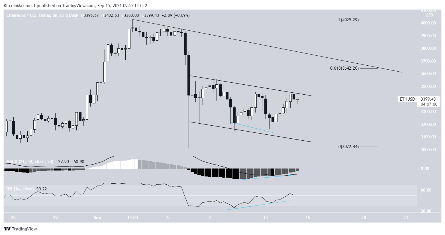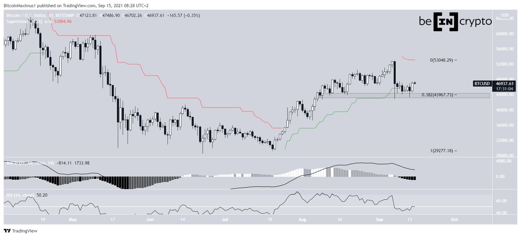 BTC bounced after reaching a low of $43,400 on Sept 13. It created a bullish engulfing candlestick the next day, going to a high of $47,250. The bounce also served to validate the $43,950 area as support. This is the 0.382 Fib retracement support level.